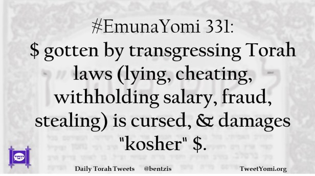 #EmunaYomi 331: $ gotten by transgressing Torah laws (lying, cheating, withholding salary, fraud, stealing) is cursed, & damages “kosher” $.