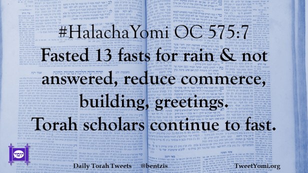 #HalachaYomi OC 575:7 Fasted 13 fasts for rain & not answered, reduce commerce, building, greetings. Torah scholars continue to fast.