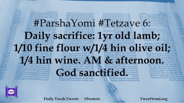 #ParshaYomi #Tetzave 6: Daily sacrifice: 1yr old lamb; 1/10 fine flour w/1/4 hin olive oil; 1/4 hin wine. AM & afternoon. God sanctified.