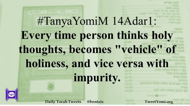 TanyaYomiM #TanyaYomiM 14Adar1 Date: February 25, 2024Author: netanelspitz #TanyaYomiM 14Adar1: Every time person thinks holy thoughts, becomes “vehicle” of holiness, and vice versa with impurity. Share this: Share on X (Opens in new window) X Share on Facebook (Opens in new window) Facebook Like Loading... Related