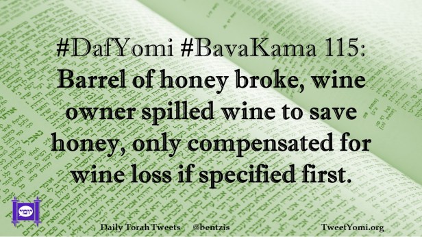 BavaKama, DafYomi #DafYomi #BavaKama 115 Date: February 27, 2024Author: netanelspitz #DafYomi #BavaKama 115: Barrel of honey broke, wine owner spilled wine to save honey, only compensated for wine loss if specified first. Share this: Share on X (Opens in new window) X Share on Facebook (Opens in new window) Facebook Like Loading... Related