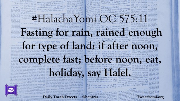 #HalachaYomi OC 575:11 Fasting for rain, rained enough for type of land: if after noon, complete fast; before noon, eat, holiday, say Halel.