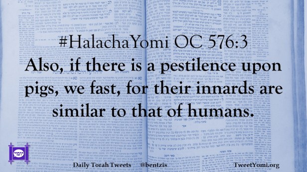 HalachaYomi #HalachaYomi OC 576:3 Date: February 27, 2024Author: netanelspitz #HalachaYomi OC 576:3 Also, if there is a pestilence upon pigs, we fast, for their innards are similar to that of humans. Share this: Share on X (Opens in new window) X Share on Facebook (Opens in new window) Facebook Like Loading... Related