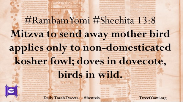 #RambamYomi #Shechita 13:8 Mitzva to send away mother bird applies only to non-domesticated kosher fowl; doves in dovecote, birds in wild.
