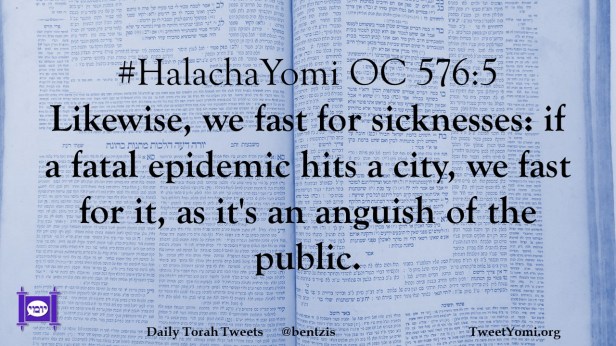 #HalachaYomi OC 576:5 Likewise, we fast for sicknesses: if a fatal epidemic hits a city, we fast for it, as it’s an anguish of the public.