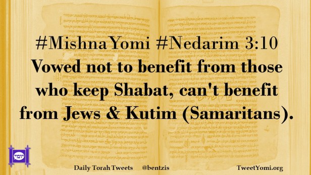 MishnaYomi, Nedarim #MishnaYomi #Nedarim 3:10 Date: February 29, 2024Author: netanelspitz #MishnaYomi #Nedarim 3:10 Vowed not to benefit from those who keep Shabat, can’t benefit from Jews & Kutim (Samaritans). Share this: Share on X (Opens in new window) X Share on Facebook (Opens in new window) Facebook Like Loading... Related
