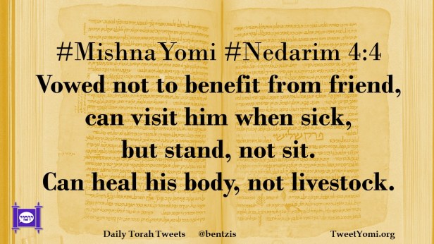 #MishnaYomi #Nedarim 4:4 Vowed not to benefit from friend, can visit him when sick, but stand, not sit. Can heal his body, not livestock.