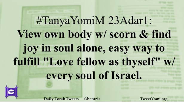 #TanyaYomiM 23Adar1: View own body w/ scorn & find joy in soul alone, easy way to fulfill “Love fellow as thyself” w/ every soul of Israel.