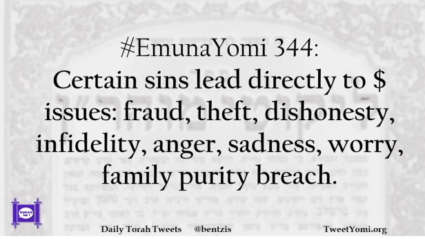#EmunaYomi 344: Certain sins lead directly to $ issues: fraud, theft, dishonesty, infidelity, anger, sadness, worry, family purity breach.