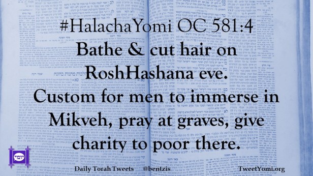 #HalachaYomi OC 581:4 Bathe & cut hair on RoshHashana eve. Custom for men to immerse in Mikveh, pray at graves, give charity to poor there.