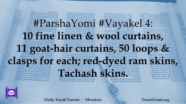 #ParshaYomi #Vayakel 4: 10 fine linen & wool curtains, 11 goat-hair curtains, 50 loops & clasps for each; red-dyed ram skins, Tachash skins.