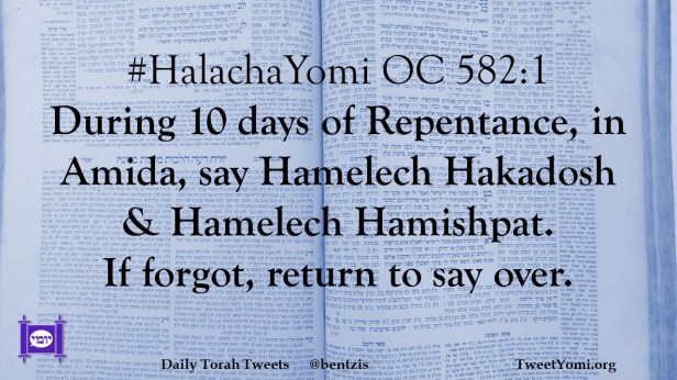 #HalachaYomi OC 582:1 During 10 days of Repentance, in Amida, say Hamelech Hakadosh & Hamelech Hamishpat. If forgot, return to say over.