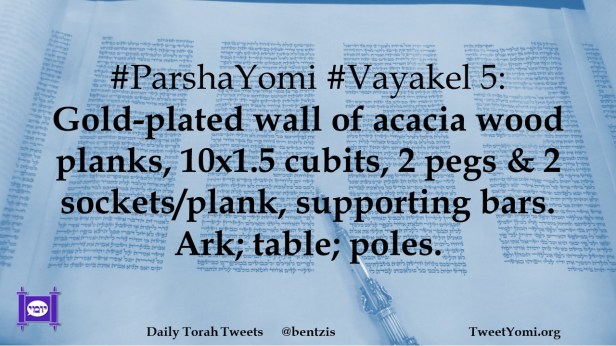 #ParshaYomi #Vayakel 5: Gold-plated wall of acacia wood planks, 10×1.5 cubits, 2 pegs & 2 sockets/plank, supporting bars. Ark; table; poles.