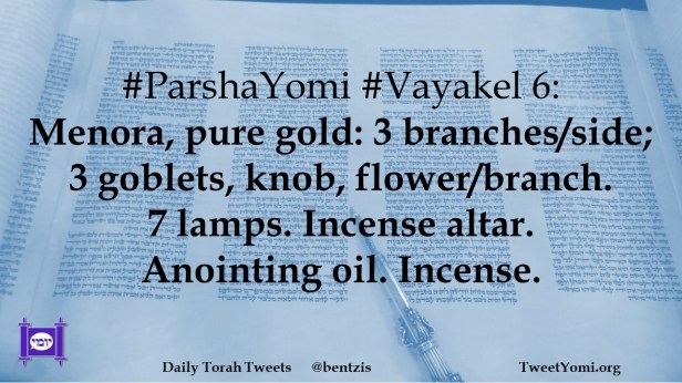 #ParshaYomi #Vayakel 6: Menora, pure gold: 3 branches/side; 3 goblets, knob, flower/branch. 7 lamps. Incense altar. Anointing oil. Incense.