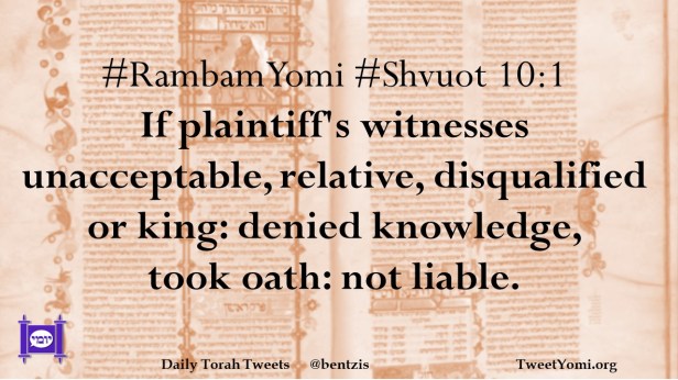 #RambamYomi #Shvuot 10:1 If plaintiff’s witnesses unacceptable, relative, disqualified or king: denied knowledge, took oath: not liable.