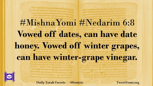 MishnaYomi, Nedarim #MishnaYomi #Nedarim 6:8 Date: March 12, 2024Author: netanelspitz #MishnaYomi #Nedarim 6:8 Vowed off dates, can have date honey. Vowed off winter grapes, can have winter-grape vinegar. Share this: Share on X (Opens in new window) X Share on Facebook (Opens in new window) Facebook Like Loading... Related