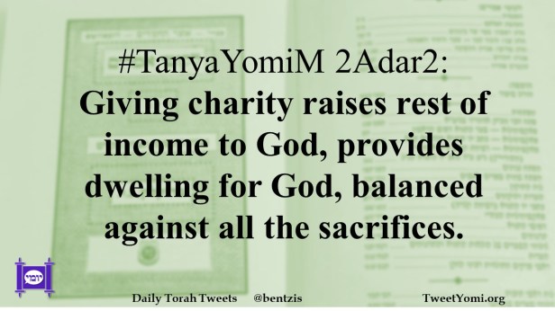 #TanyaYomiM 2Adar2: Giving charity raises rest of income to God, provides dwelling for God, balanced against all the sacrifices.
