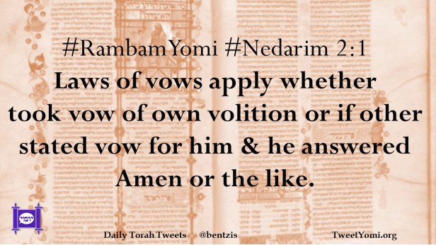 #RambamYomi #Nedarim 2:1 Laws of vows apply whether took vow of own volition or if other stated vow for him & he answered Amen or the like.