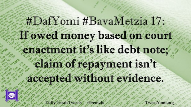 #DafYomi #BavaMetzia 17: If owed money based on court enactment it’s like debt note; claim of repayment isn’t accepted without evidence.
