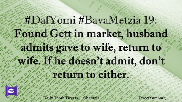 #DafYomi #BavaMetzia 19: Found Gett in market, husband admits gave to wife, return to wife. If he doesn’t admit, don’t return to either.