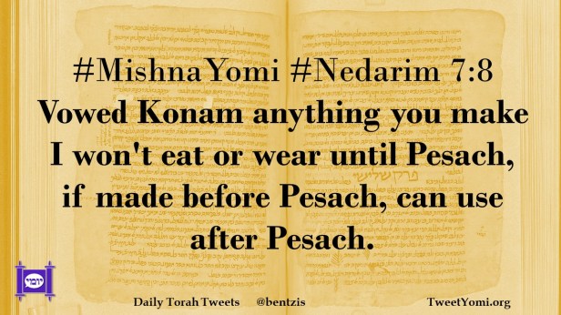 #MishnaYomi #Nedarim 7:8 Vowed Konam anything you make I won’t eat or wear until Pesach, if made before Pesach, can use after Pesach.