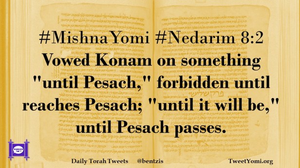 #MishnaYomi #Nedarim 8:2 Vowed Konam on something “until Pesach,” forbidden until reaches Pesach; “until it will be,” until Pesach passes.