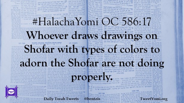 HalachaYomi #HalachaYomi OC 586:17 Date: March 19, 2024Author: netanelspitz #HalachaYomi OC 586:17 Whoever draws drawings on Shofar with types of colors to adorn the Shofar are not doing properly. Share this: Share on X (Opens in new window) X Share on Facebook (Opens in new window) Facebook Like Loading... Related
