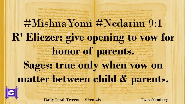 #MishnaYomi #Nedarim 9:1 R’ Eliezer: give opening to vow for honor of parents. Sages: true only when vow on matter between child & parents.