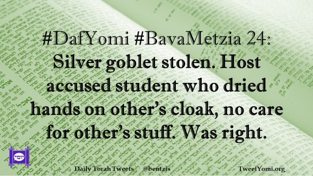 #DafYomi #BavaMetzia 24: Silver goblet stolen. Host accused student who dried hands on other’s cloak, no care for other’s stuff. Was right.