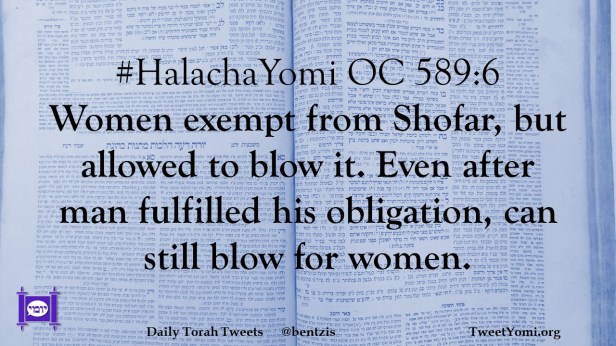 #HalachaYomi OC 589:6 Women exempt from Shofar, but allowed to blow it. Even after man fulfilled his obligation, can still blow for women.