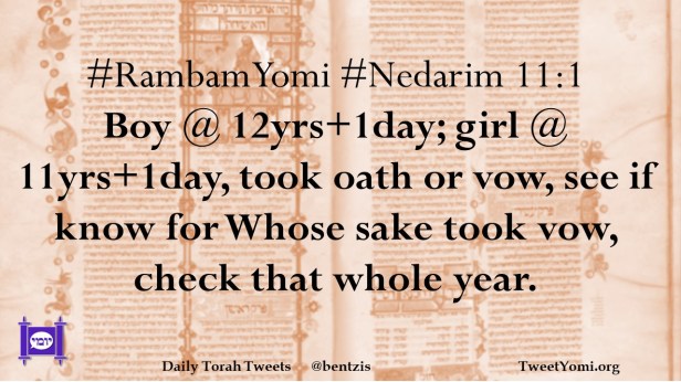 #RambamYomi #Nedarim 11:1 Boy @ 12yrs+1day; girl @ 11yrs+1day, took oath or vow, see if know for Whose sake took vow, check that whole year.