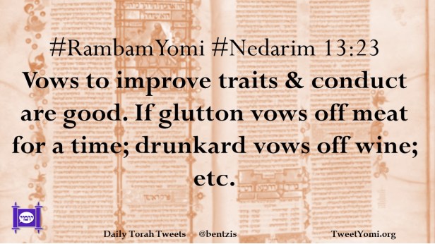 #RambamYomi #Nedarim 13:23 Vows to improve traits & conduct are good. If glutton vows off meat for a time; drunkard vows off wine; etc.