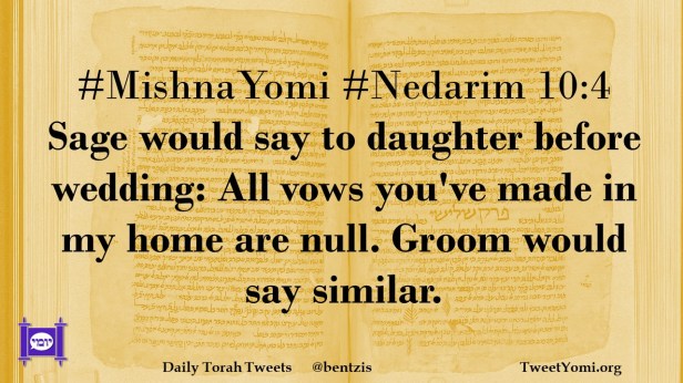 #MishnaYomi #Nedarim 10:4 Sage would say to daughter before wedding: All vows you’ve made in my home are null. Groom would say similar.