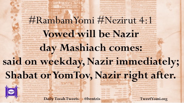 #RambamYomi #Nezirut 4:1 Vowed will be Nazir day Mashiach comes: said on weekday, Nazir immediately; Shabat or YomTov, Nazir right after.