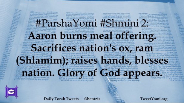 #ParshaYomi #Shmini 2: Aaron burns meal offering. Sacrifices nation’s ox, ram (Shlamim); raises hands, blesses nation. Glory of God appears.