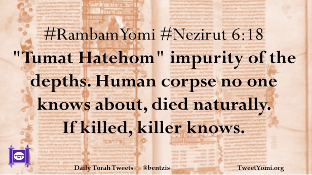 #RambamYomi #Nezirut 6:18 “Tumat Hatehom” impurity of the depths. Human corpse no one knows about, died naturally. If killed, killer knows.