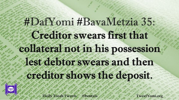 #DafYomi #BavaMetzia 35: Creditor swears first that collateral not in his possession lest debtor swears and then creditor shows the deposit.