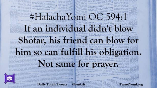 #HalachaYomi OC 594:1 If an individual didn’t blow Shofar, his friend can blow for him so can fulfill his obligation. Not same for prayer.