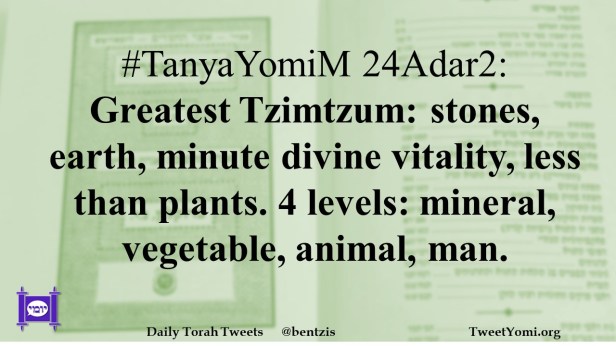 #TanyaYomiM 24Adar2: Greatest Tzimtzum: stones, earth, minute divine vitality, less than plants. 4 levels: mineral, vegetable, animal, man.