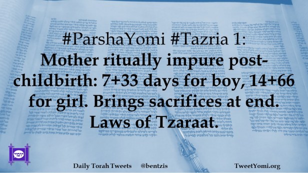#ParshaYomi #Tazria 1: Mother ritually impure post-childbirth: 7+33 days for boy, 14+66 for girl. Brings sacrifices at end. Laws of Tzaraat.