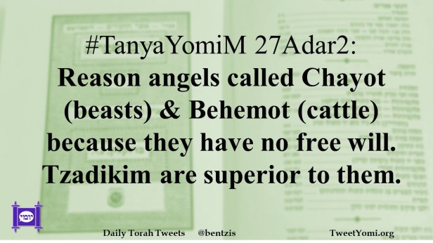 #TanyaYomiM 27Adar2: Reason angels called Chayot (beasts) & Behemot (cattle) because they have no free will. Tzadikim are superior to them.