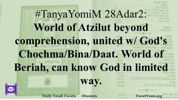 #TanyaYomiM 28Adar2: World of Atzilut beyond comprehension, united w/ God’s Chochma/Bina/Daat. World of Beriah, can know God in limited way.