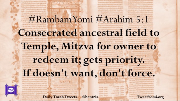 #RambamYomi #Arahim 5:1 Consecrated ancestral field to Temple, Mitzva for owner to redeem it; gets priority. If doesn’t want, don’t force.