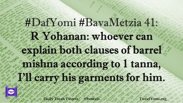#DafYomi #BavaMetzia 41: R Yohanan: whoever can explain both clauses of barrel mishna according to 1 tanna, I’ll carry his garments for him.