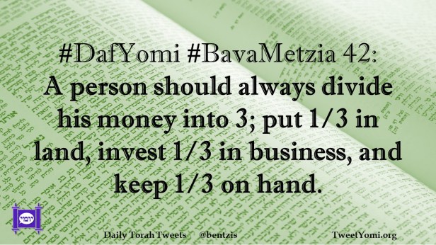 #DafYomi #BavaMetzia 42: A person should always divide his money into 3; put 1/3 in land, invest 1/3 in business, and keep 1/3 on hand.