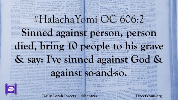 #HalachaYomi OC 606:2 Sinned against person, person died, bring 10 people to his grave & say: I’ve sinned against God & against so-and-so.