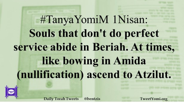 #TanyaYomiM 1Nisan: Souls that don’t do perfect service abide in Beriah. At times, like bowing in Amida (nullification) ascend to Atzilut.