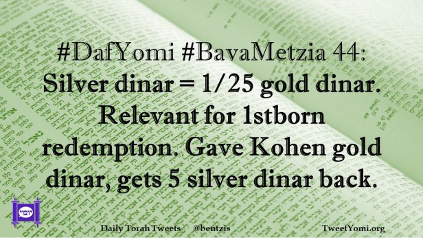 #DafYomi #BavaMetzia 44: Silver dinar = 1/25 gold dinar. Relevant for 1stborn redemption. Gave Kohen gold dinar, gets 5 silver dinar back.