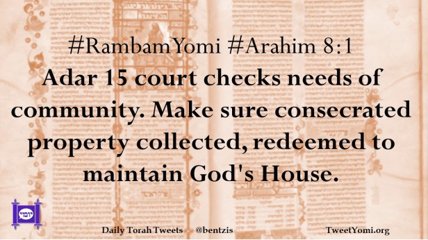 #RambamYomi #Arahim 8:1 Adar 15 court checks needs of community. Make sure consecrated property collected, redeemed to maintain God’s House.