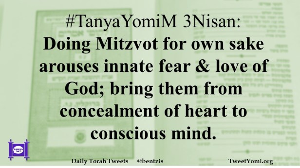 #TanyaYomiM 3Nisan: Doing Mitzvot for own sake arouses innate fear & love of God; bring them from concealment of heart to conscious mind.